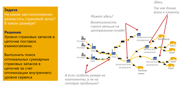 - Многоуровневая оптимизация запаса компенсирует ошибки прогнозов, сжатость сроков поставки и проблемы по неточному количеству. Позволяет предоставлять клиентам максимально высокий уровень обслуживания.